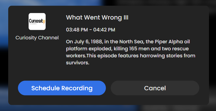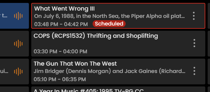 - Once the recording is scheduled, it should appears in the guide like in the image below, confirming that's Scheduled.