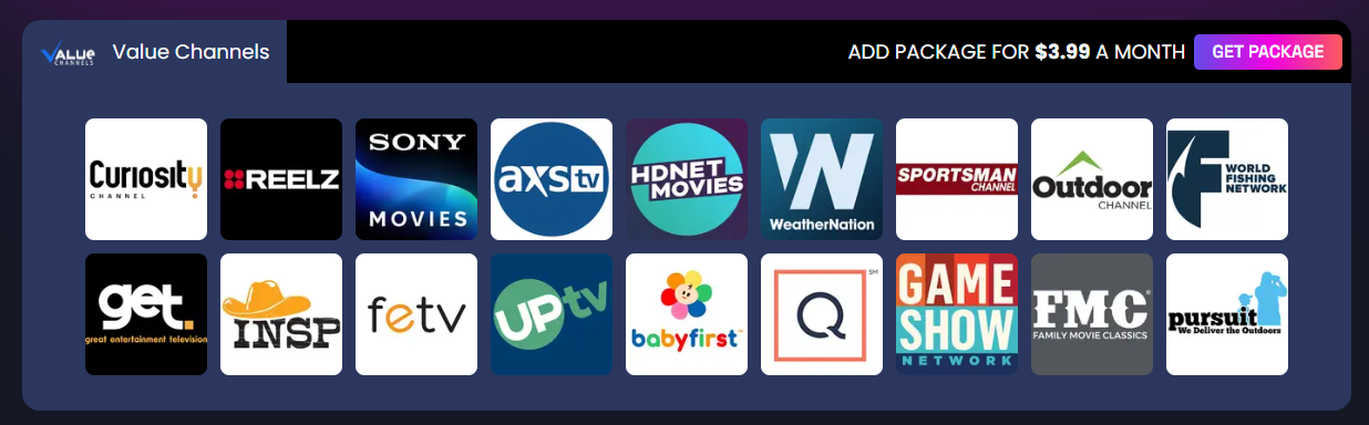 With the Value Channels you also have unlimited DVR, allowing you to record your favorite shows and movies from that particular channels section.