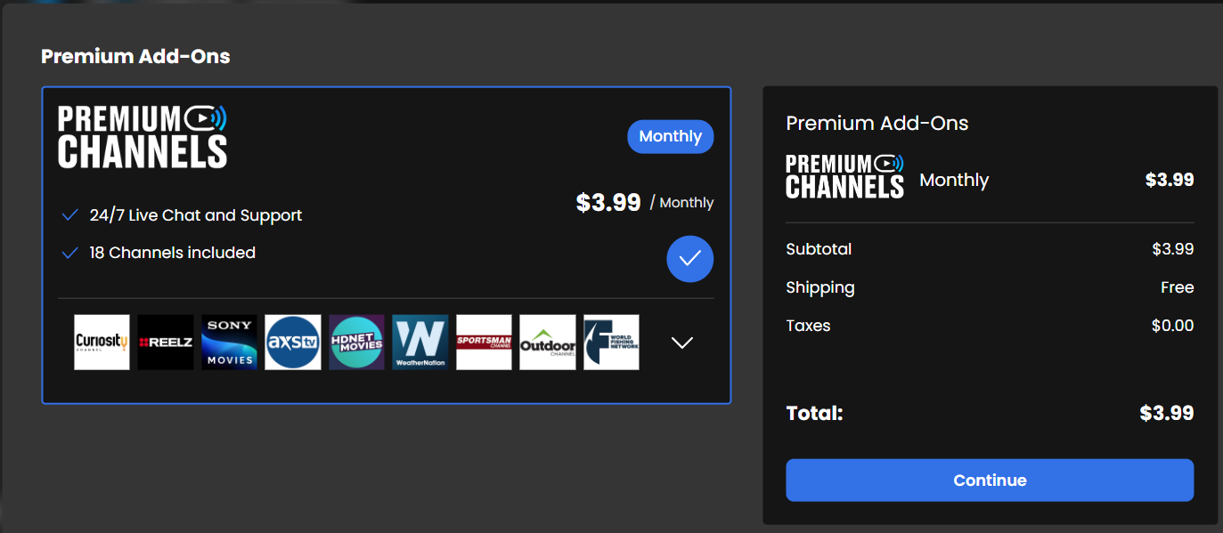 The Value Channels addon includes 18 premium live channels (see image below), in addition to the hundreds of free channels that you already receive with a FreeCast subscription.